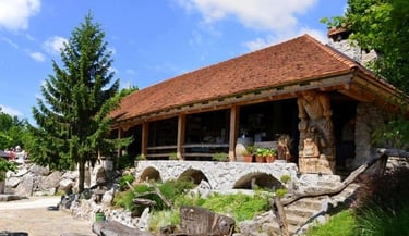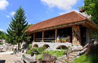 čudovita planinska koča z zbirko del kiparjev z motorno žago